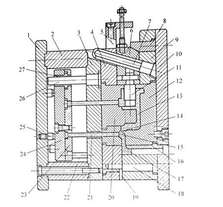 1—動(dòng)模座板 2—墊塊 3—動(dòng)模支承板 4—動(dòng)模套板 5—抽芯限位擋塊6— 抽芯滑塊 7—抽芯斜銷 8—楔緊塊 9—定模套板 10—定模座板 11—側(cè)抽型芯 12—定模鑲塊 13—型腔 14—內(nèi)澆道 15—橫澆道 16—澆口套 17—直澆道 18—導(dǎo)柱 19—導(dǎo)套 20—動(dòng)模鑲塊 21—推桿 22—復(fù)位桿 23—推桿固定板 24—推板 25—擋釘 26— 推板導(dǎo)柱 27—推板導(dǎo)套